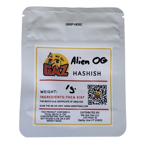 Our Alien OG Hashish is made with kief sourced from hemp grown in the USA using organic practices, testing at or below 0.3% Delta-9 THC for a pure, legal experience. Sprinkle it in a joint, press it into rosin, or enjoy it straight – this hashish is your ticket to a cosmic, feel-good voyage. Ready to blast off? Grab yours now at We Got Gaz and let the stars align for your next high!